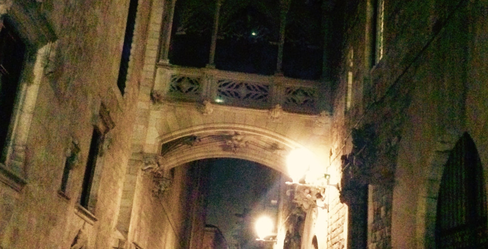 Nous quittons donc notre hôtel, en prenant l'avenue à droite... L'Universitat de Barcelona est imposante et fait face à l'esplanade sur laquelle s'exercent quelques adeptes freestyle de skate et de BMX. La Rambla, où vendeurs de gadgets à la sauvette, promeneurs solitaires ou en couple et restaurateurs se côtoient, est très animée, fidèle à sa réputation. Plus loin, nous nous éloignons de la foule en prenant une ruelle à gauche. Après avoir traversé quelques rues jalonnées de galeries, de boutiques design et de mode, je suis saisie par l'architecture des Torres Romanes surplombant un marché éphémère à ciel ouvert. C'est en quelques sortes l'entrée de la Ciutat Vella (le quartier gothique). Nous empruntons alors career del Bisbe, le nez levé vers le ciel pour profiter des bâtisses de la ville, toutes aussi fascinantes les unes que les autres. Les notes de guitare et la voix mélancoliques qui nous parviennent sont de plus en plus perceptibles. Le soliste est là adossé à une façade caractéristique du Palau de la generalitat, offrant un concert intimiste à la dizaine de noctambules qui ont pris place face à lui, rue de la Pietat. Le pont contemporain d'inspiration gothique de la rue Bisbe à quelques pas est la pièce maîtresse de cette scène nocturne improvisée … Je ressens comme une magie sourde me saisir de l’intérieur. J'ai envie de m’engouffrer dans Barcelone comme dans un labyrinthe minéral et pavé qui n'aurait pas d'issue...